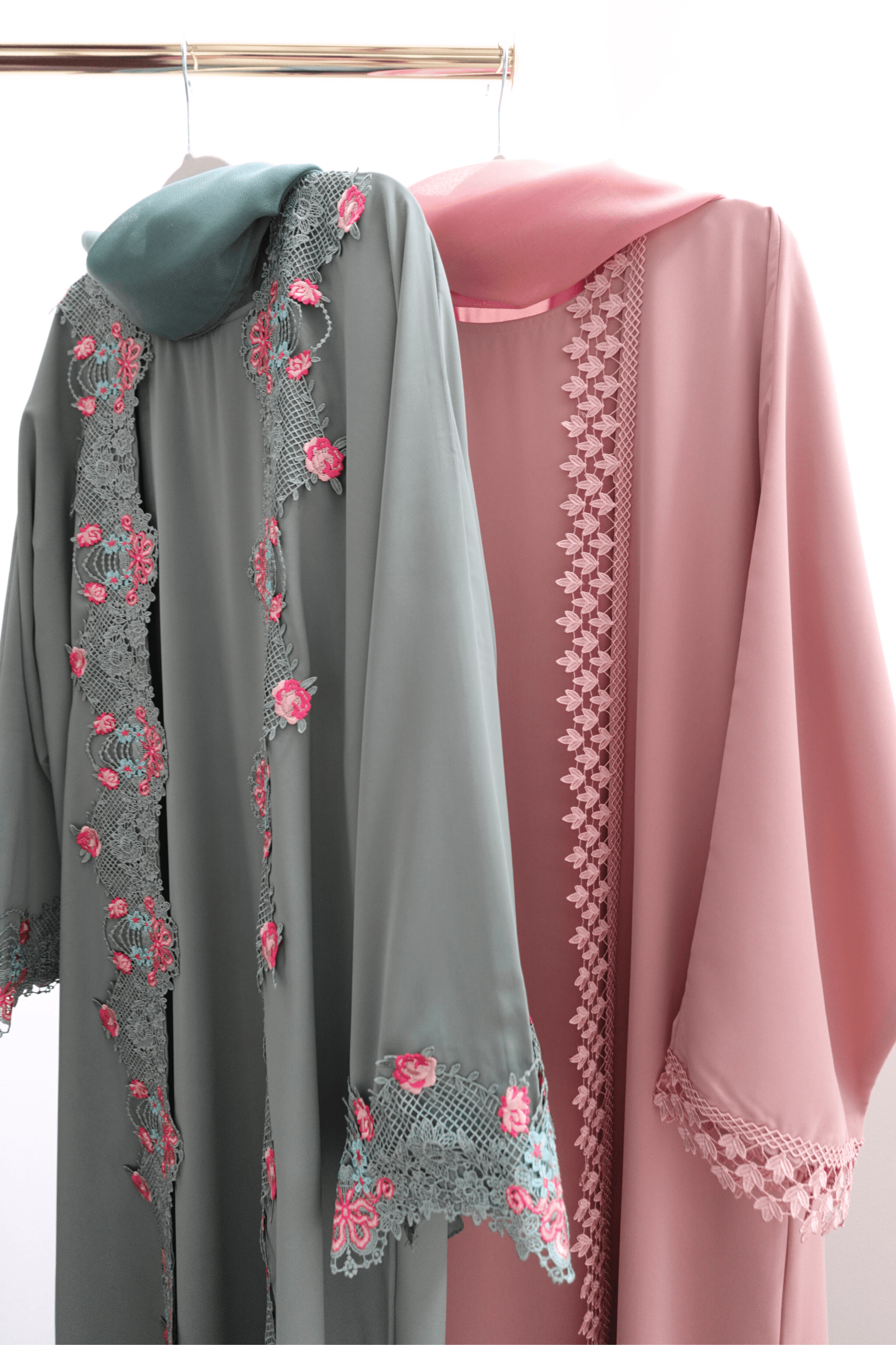 Soft and feminine, this 3-piece set features delicate floral motifs that grace the front and sleeves of the outer abaya, paired with a sleek inner dress and matching shawl. Breathable, elegant, and effortlessly refined — perfect for any occasion.