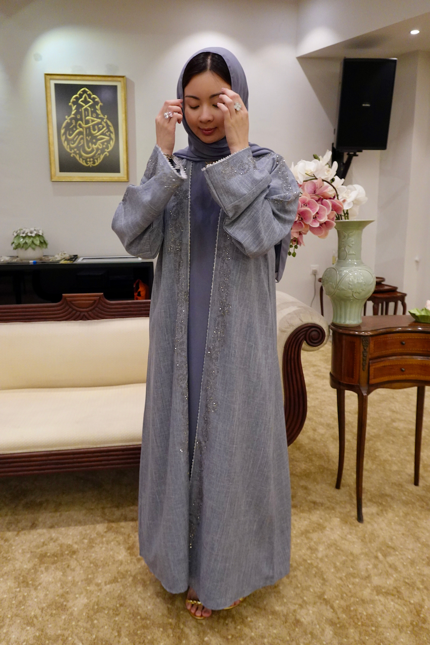 Timeless and sophisticated, this 3-piece abaya features delicate rhinestone embellishments along the sleeve and front - adding a subtle yet striking shimmer with every step. Crafted from lightweight, breathable fabric, it offers effortless elegance for day or night.