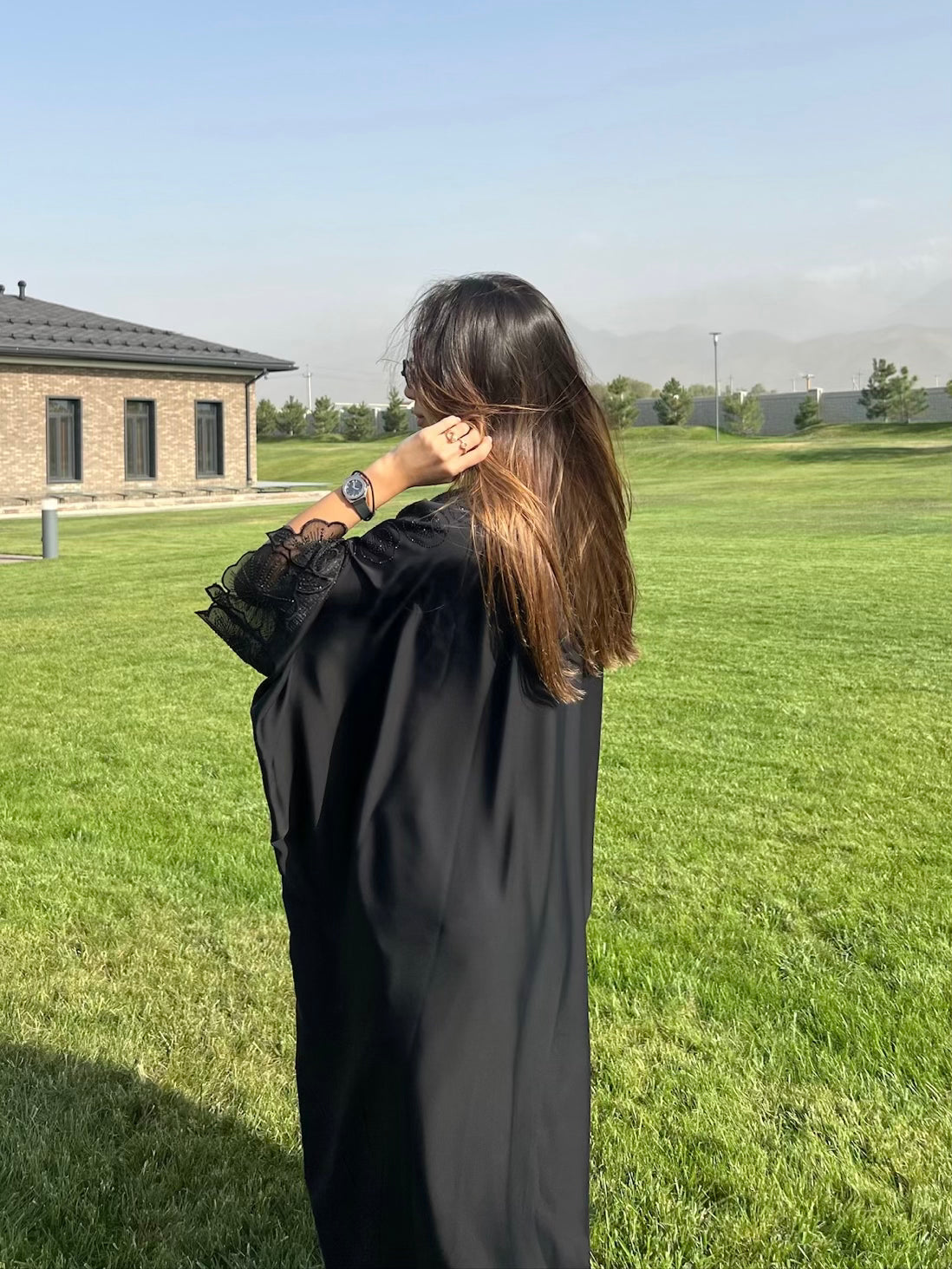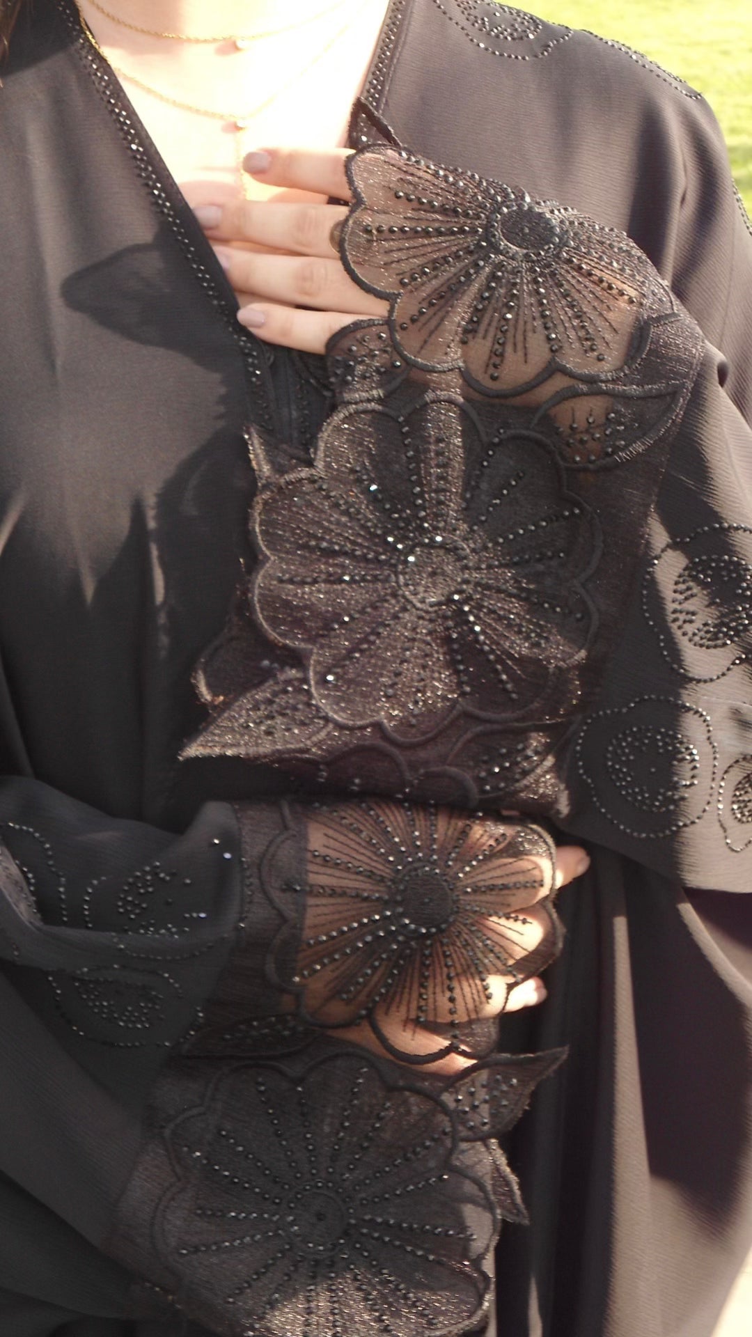 Crafted from soft organza, this 2-piece set featuring floral-embellished sleeves with hand-applied rhinestones. Includes a lightweight abaya dress and a matching shawl. Airy, breathable, and refined for any occasion