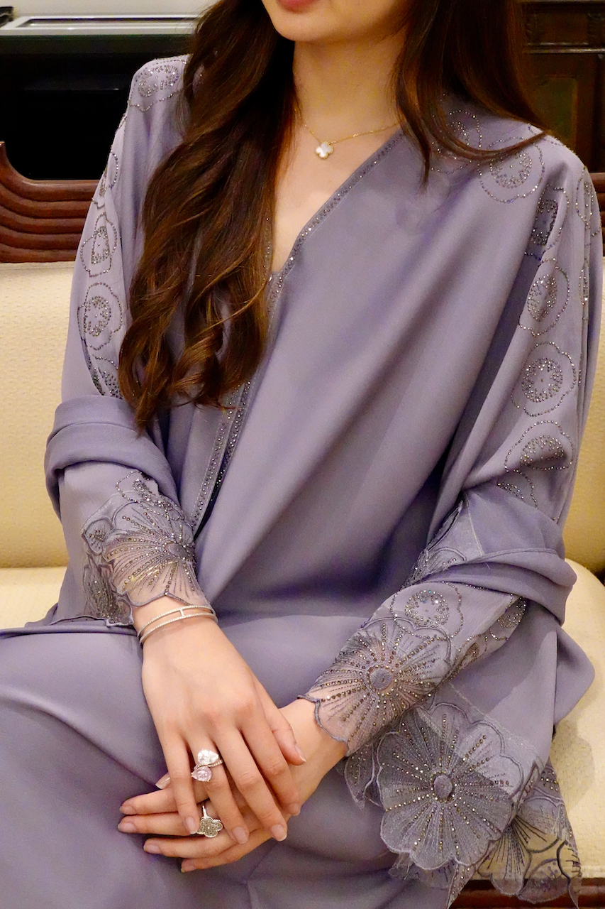 Crafted from soft organza, this 2-piece set featuring floral-embellished sleeves with hand-applied rhinestones. Includes a lightweight abaya dress and a matching shawl. Airy, breathable, and refined for any occasion