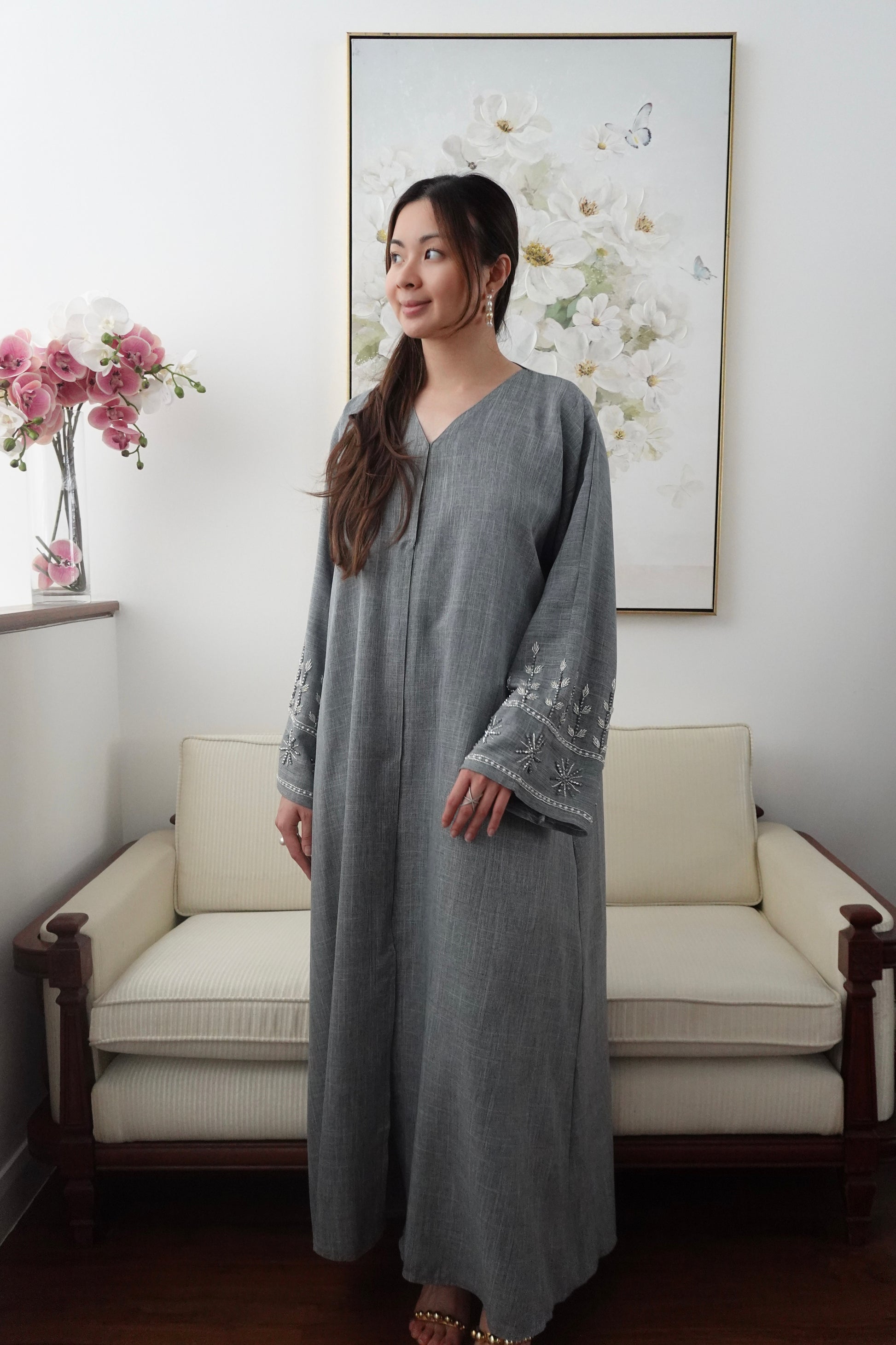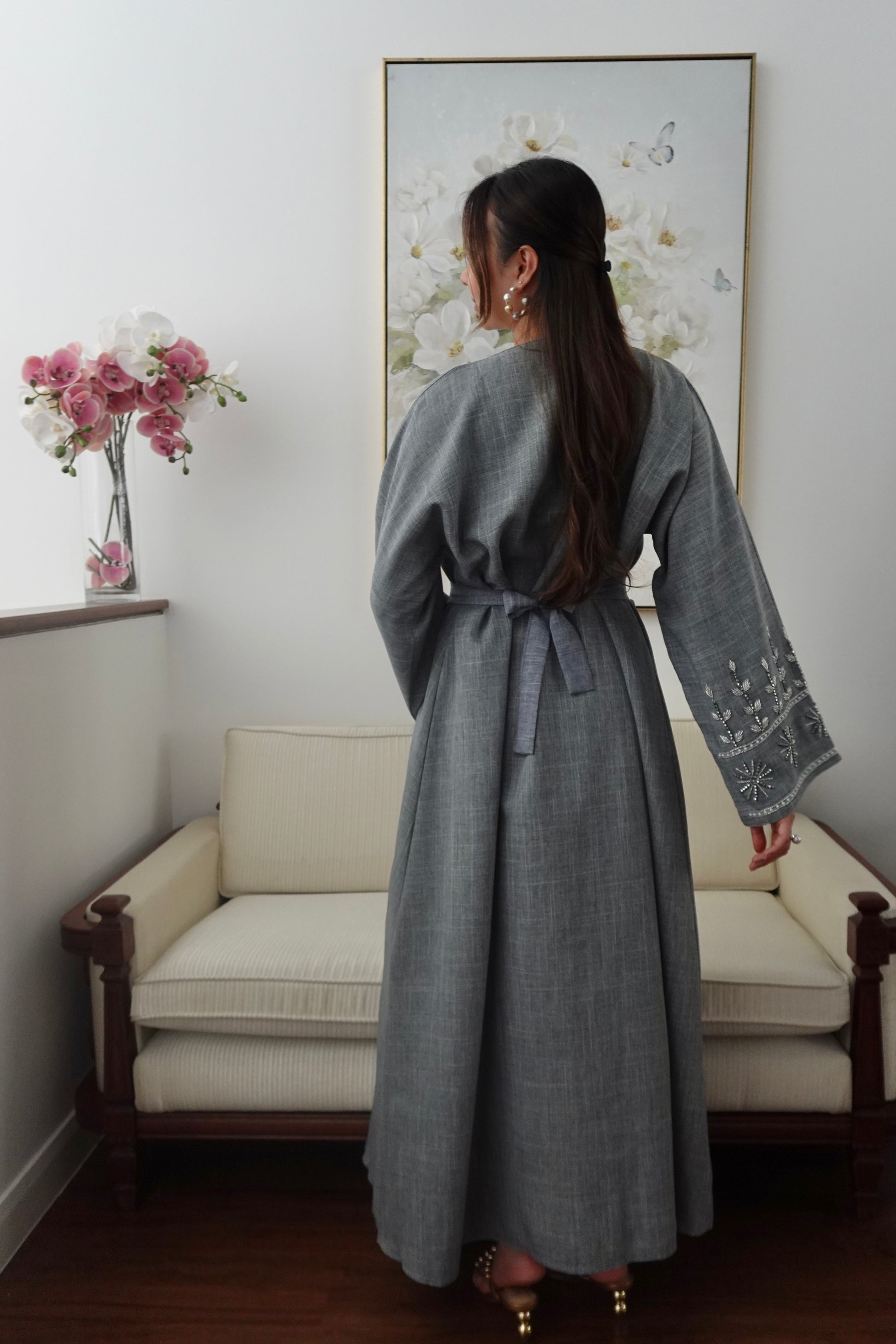 Timeless and sophisticated, this 3-piece abaya features delicate rhinestone embellishments along the sleeve and front - adding a subtle yet striking shimmer with every step. Crafted from lightweight, breathable fabric, it offers effortless elegance for day or night.